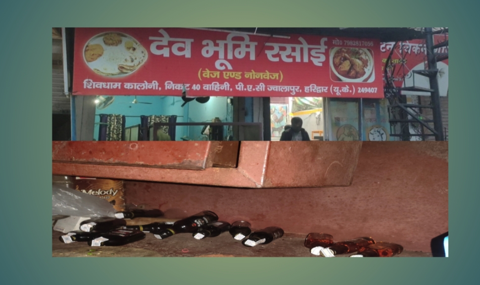 हरिद्वार, ब्यूरो रिपोर्ट। न्यू हरिद्वार में रानी पुर चौराहे से लेकर ज्वालापुर तक अवैध तौर पर हर मुहल्ले में शराब की बिक्री हो रही है । और तो और अंग्रेजी शराब का पौवा 20 से 50 रुपए तक महंगा दिया जा रहा है । हद तो तब हो गई जब पीएसी गेट सुभाष नगर, ज्वालापुर के पास एक दुकान जिस का नाम तो देवभूमि रसोई,ओर वह भी शिवधाम कलोनी में बिना सील शराब बेची जा रही थी वह भी महंगी, और जब दुकान के अंदर जा कर देखा तो वहां पर मीट भी पकाया जा रहा था । शिवजी के नाम से कलोनी ओर देवभूमि की आड़ में घिनौना काम किया जा रहा था।जो कि शरेआम आस्था से खिलवाड़ किया जा रहा है।