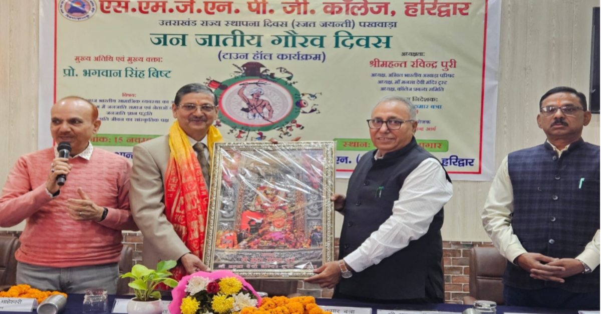 15 नवम्बर 2025 हरिद्वार। हर्षिता। एस. एम. जे. एन. पी. जी. कॉलेज, हरिद्वार में आज आतंरिक गुणवत्ता आश्वासन प्रकोष्ठ द्वारा उत्तराखंड स्थापना रजत जयन्ती उत्सव की श्रंखला में जनजातीय गौरव दिवस पर टाउन हॉल कार्यक्रम का आयोजन किया गया। कार्यक्रम में उपस्थित महाविद्यालय के प्राचार्य प्रो सुनील कुमार बत्रा ने भगवान बिरसा मुंडा की 150 वीं जयन्ती पर उन्हें नमन करते हुए कहा कि जनजातीय गौरव दिवस जननायकों के बलिदान और शौर्य को स्मरण कराता दिन हैं। प्रो बत्रा ने कहा कि जनजातियों में अनेकों ऐसे जननायक हुए हैं जिनका भारत की स्वाधीनता में महत्वपूर्ण योगदान रहा हैं। आज आवश्यकता हैं कि हमारी युवा पीढ़ी उन जननायको के विषय में जान सके। प्रो बत्रा ने कहा कि अखाड़ो में जिन मणियों से अखाड़े की परिकल्पनाबनती है वो भी जनजातियों का ही एक स्वरूप होती हैं। उन्होंने बताया कि भगवान रामचंद्र को बना हुआ आज के समय हैं विभिन्न आदिवासी एवं जनजातियों का सहयोग प्राप्त हुआ था जिसमें मुख्य रूप से निशाद राज ,भिवंडी ,एवं वानर आदि प्रमुख थे इस अवसर पर मुख्य अतिथि तथा मुख्य वक्ता के रूप में उपस्थित प्रसिद्ध समाजशास्त्री प्रो भगवान सिंह बिष्ट ने कहा कि जनजातियाँ भारत की सामजिक, सांस्कृतिक विरासत तथा ज्ञान पद्धति की पृष्ठभूमि रही हैं। उन्होंने कहा कि आधुनिक समय में सामाजिक जागरूकता बढ़ाकर आदिवासी संस्कृतियों के संरक्षण को सुनिश्चित किया जा सकता है तथा साथ ही उनके जीवन स्तर में सुधार लाकर भारत की विकास यात्रा में एकीकृत कर सकते हैं