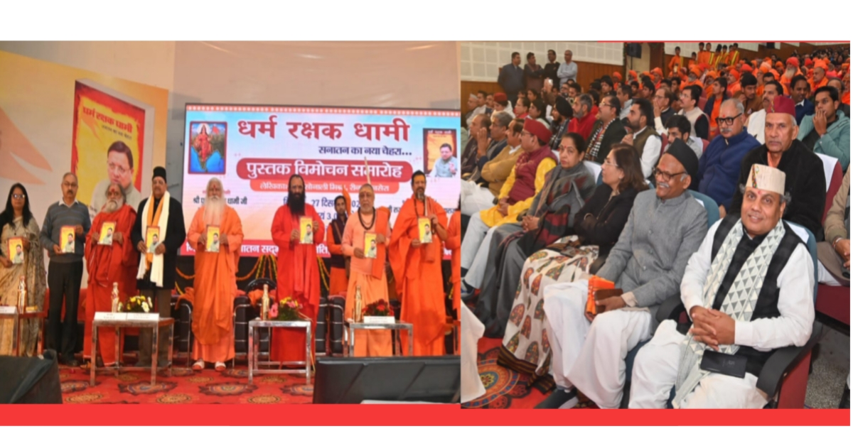 हरिद्वार 27 दिसम्बर 2025, हर्षिता। राष्ट्र संचालन के लिए धर्म नीति का होना आवश्यक है, धर्म की रक्षा होगी तभी राष्ट्र सुरक्षित रहेगा। राष्ट्र-राज्य की सुरक्षा को चुनौती दे रही जिहादी मानसिकता को समाप्त करने में जिस तरह मुख्यमंत्री पुष्कर सिंह धामी ने ताबड़ तोड़ कार्यवाही की है, उसे डॉ. सोनाली मिश्रा व रीना मानसेरा ने लिपिबद्ध कर सहरानीय कार्य किया है। यह उद्गगार सनातन सद्भावना समिति द्वारा आयोजित कार्यक्रम में जगतगुरु शंकराचार्य स्वामी राजराजेश्वराश्रम महाराज ने धर्म रक्षक धामी पुस्तक के विमोचन अवसर पर ऋषिकुल सभागार में दिए।