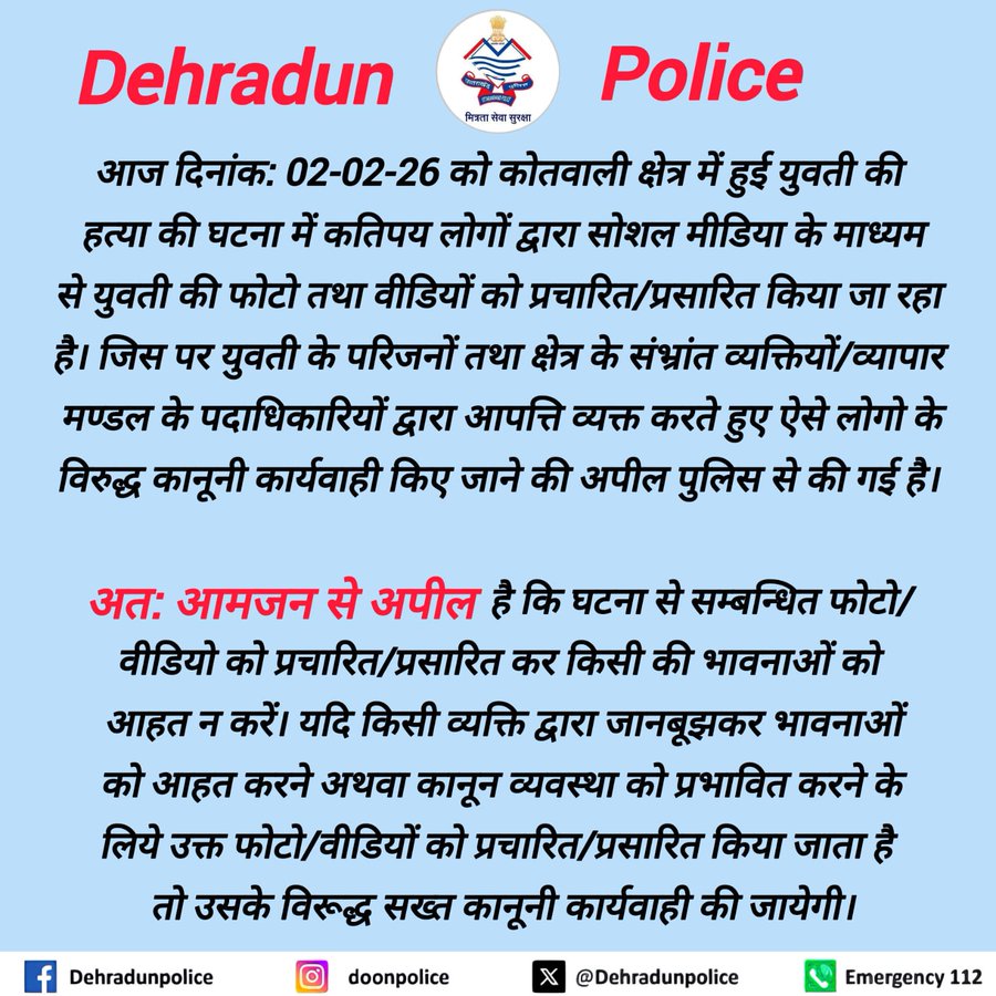 पुलिस ने लोगों से की ये अपील: एक तरफ जहां लोग इस हत्याकांड से आक्रोशित हैं, वहीं कुछ लोगों द्वारा युवती की फोटो और वीडियो सोशल मीडिया पर प्रसारित करने पर देहरादून पुलिस ने आपत्ति जताई है. एसएसपी अजय सिंह ने लोगों से अपील की है कि युवती की फोटो और वीडियो प्रसारित नहीं करें. ऐसा करने वालों पर कानूनी कार्रवाई की बात कही गई है.