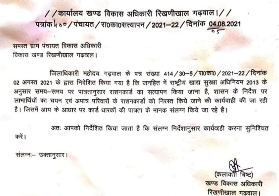 रिखणीखाल,प्रभुपाल सिंह रावत।प्रथम पक्ष- खंड विकास अधिकारी रिखणीखाल ने प्रखंड के समस्त ग्राम पंचायत विकास अधिकारियों को फ़रमान जारी किया है कि जनहित में राष्ट्रीय खाद्यान्न सुरक्षा अधिनियम 2013 के अनुसार समय समय पर पात्रतानुसार राशन कार्ड का सत्यापन किया जाना है जिसके लिए सभी ग्राम पंचायत विकास अधिकारीगण कार्रवाई करना सुनिश्चित करें।
