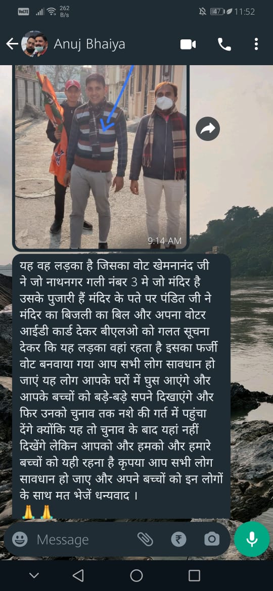 बता चले कि हमेशा से चर्चाओं में रहने वाले पार्षद के खिलाफ क्षेत्रवासी अब मुखर होकर बोल रहे हैं यही नही कल मंगलवार को उन्होंने अपने फोन से नाथ नगर गली न .3 शिव मंदिर के एक संत खेमनाथ योगी को भी धमकी दे डाली संत ने आज मीडिया के सामने पार्षद पर गंभीर आरोप लगाए, क्षेत्रवासियों का कहना है की पार्षद अनुज सिंह देर रात्रि तक लोगों के व्हाट्सएप पर मैसेज भेजते रहते हैं यह कोई पहला मामला नहीं है अनुज सिंह पहले भी बहुत विषय को लेकर चर्चाओं में रहे हैं !