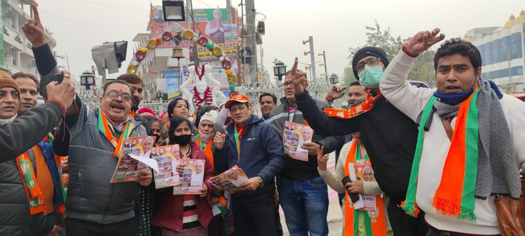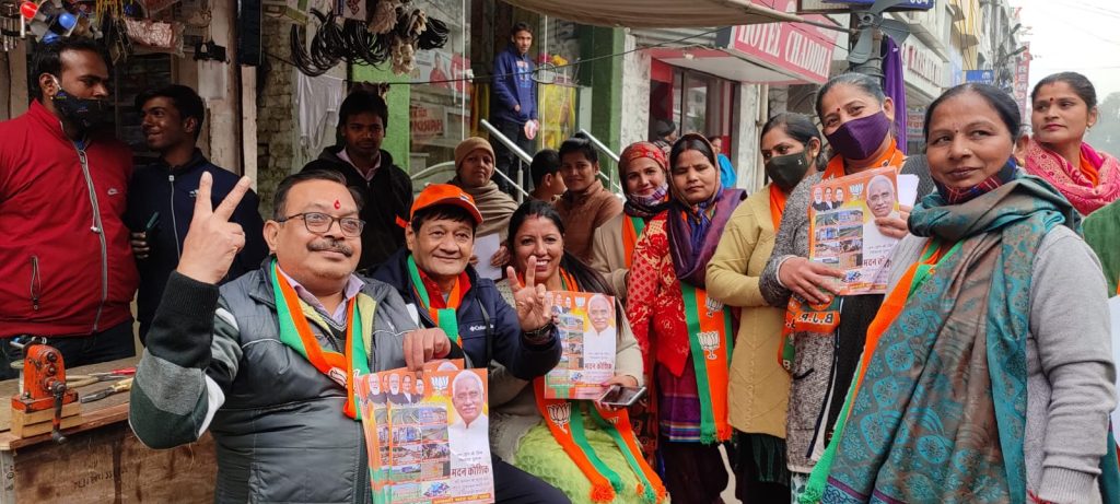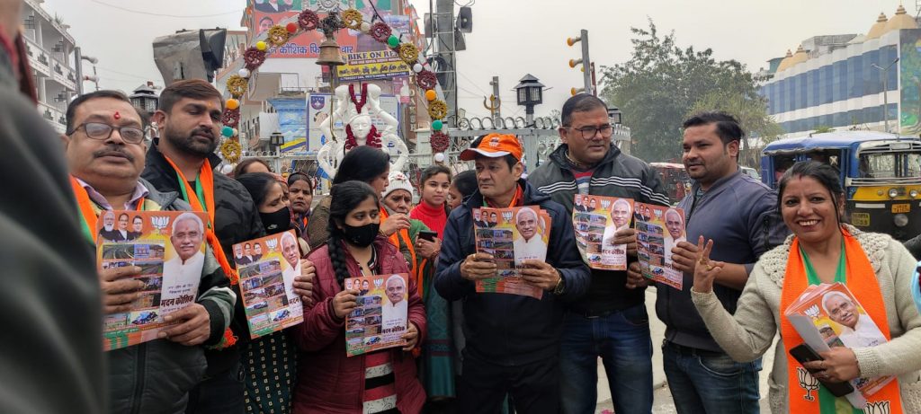 हरिद्वार,गगन नामदेव।आज मायापुर क्षेत्र में छोटे पर्दे के प्रसिद्ध कलाकार किशोर भानुशाली ( जूनियर देवानन्द) ने प्रदेश भाजपा कार्यकारिणी सदस्य सुभाष चंद के नेतृत्व में भाजपा प्रत्याशी मदन कौशिक के लिए प्रचार करते हुए क्षेत्र में वोट मांगे , जूनियर देवानंद ने क्षेत्र में जनसंपर्क के दौरान ऐसा माहौल बना दिया कि उन्हें देखने के लिए क्षेत्र की जनता सड़कों पर उमड़ पड़ी,ओर चारों और मदन कौशिक जिंदाबाद के नारे लगाने लगे ,जनता भाजपा को भारी मतों से जिताने का मन बना चुकी है,जनता का पूर्ण समर्थन मिल रहा है !