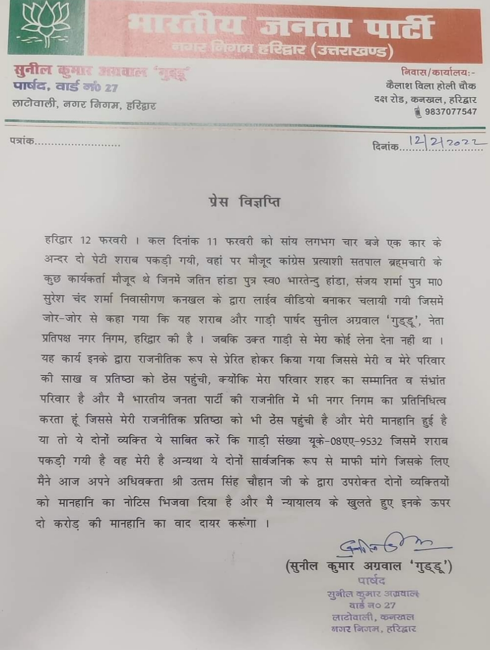 भाजपा पार्षद सुनील अग्रवाल ने उनकी छवि को धूमिल करने का आरोप लगाते हुए तीन कांग्रेसी नेताओं को मानहानि का नोटिस भेजा